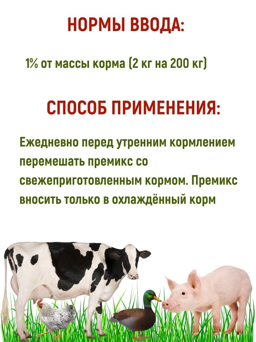 Ежедневно перед утренним кормлением перемешать премикс со свежеприготовленным кормом. Премикс вносить только в охлаждённый корм.