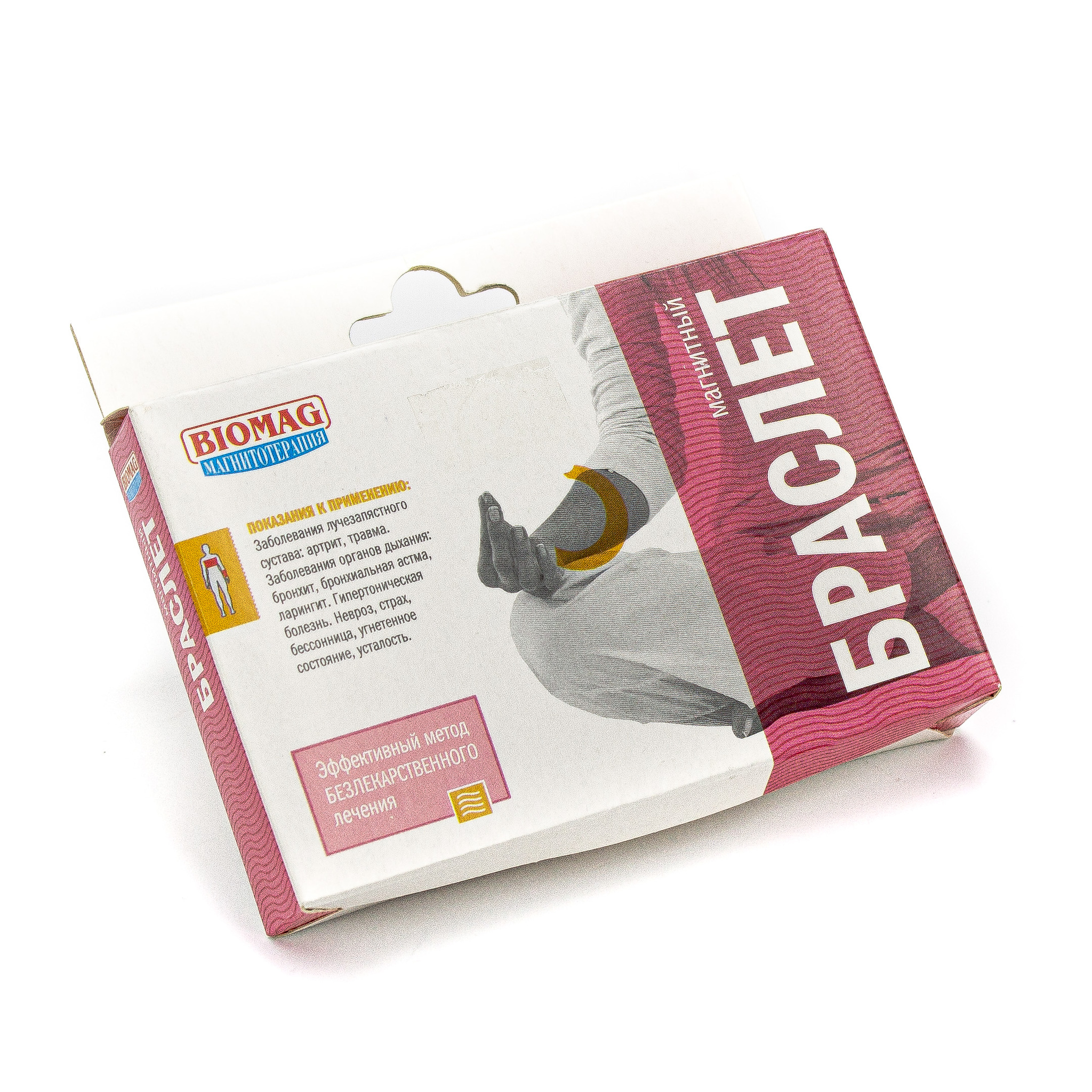 Аппликатор для запястья Биомаг изготовлен в виде гибкого эластичного браслета, в котором расположены сферические магниты. При использовании браслет надевают на руку магнитной стороной к телу и закрепляют застёжкой-тренчиком. Браслет на руку прост в эксплуатации и не стесняет движений во время процедур. Магнитная индукция: 50 МТл . Магнитные свойства сохраняются 7 — 8 лет.