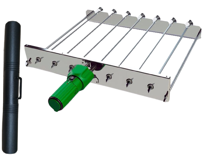 Набор шампуров подарочный питается от сети 220В. Механизм вращения шампуров металлических сделан из нержавеющей стали и представляет собой насадку, которую можно ставить на мангал, гриль, барбекю, кирпичи. Механизм легко собирается и разбирается, и упаковывается с тубус.