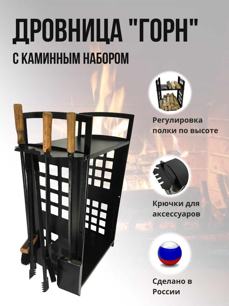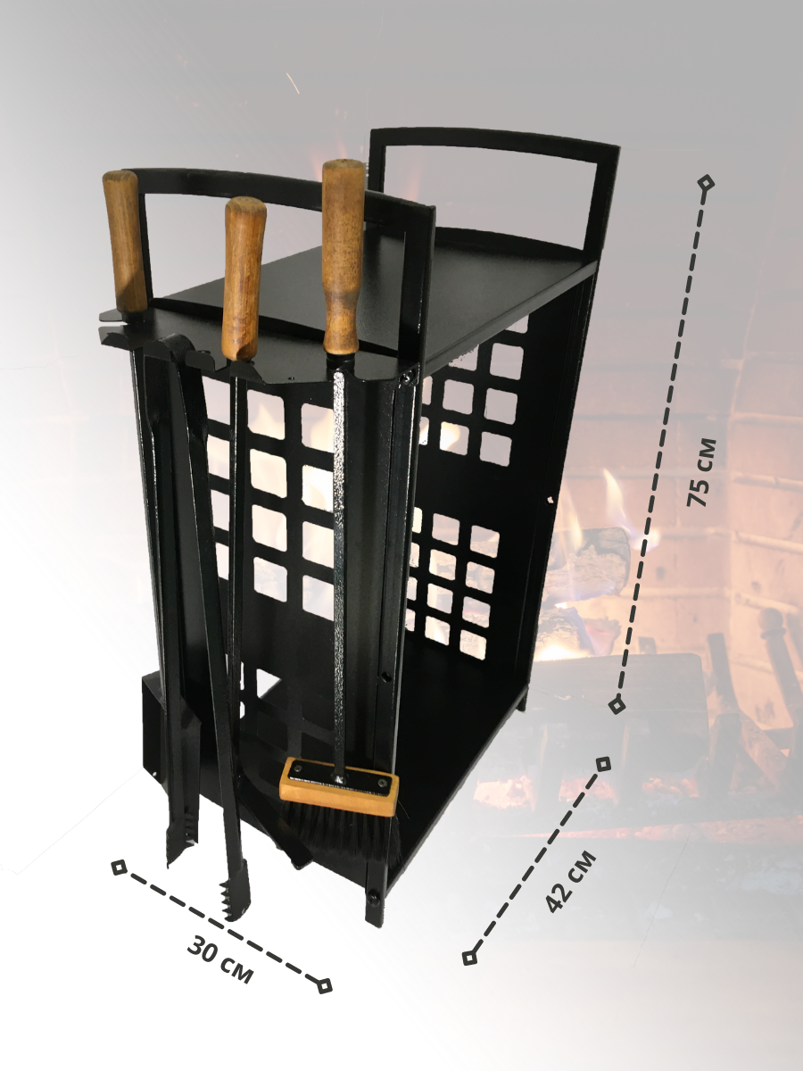 Металлическая дровница «Горн» с набором по уходу за камином является незаменимым атрибутом для компактного хранения дров в загородном доме или на даче. Подставка для дров позволяет держать под рукой небольшое количество поленьев, которое позволит сразу же развести огонь; избавит от мусора; облегчит уборку, а также предотвратит повреждение пола острыми сучками и щепками; имеет эстетичный вид, что придаёт особый стиль интерьер. Аксессуар для хранения дров «Горн» легко собирается в течение 10 минут. Изделие выполнено из 1,5 мм листового металла – сталь3 с порошковым покрытием, что обеспечивает надежность, прочность и долговечность конструкции.