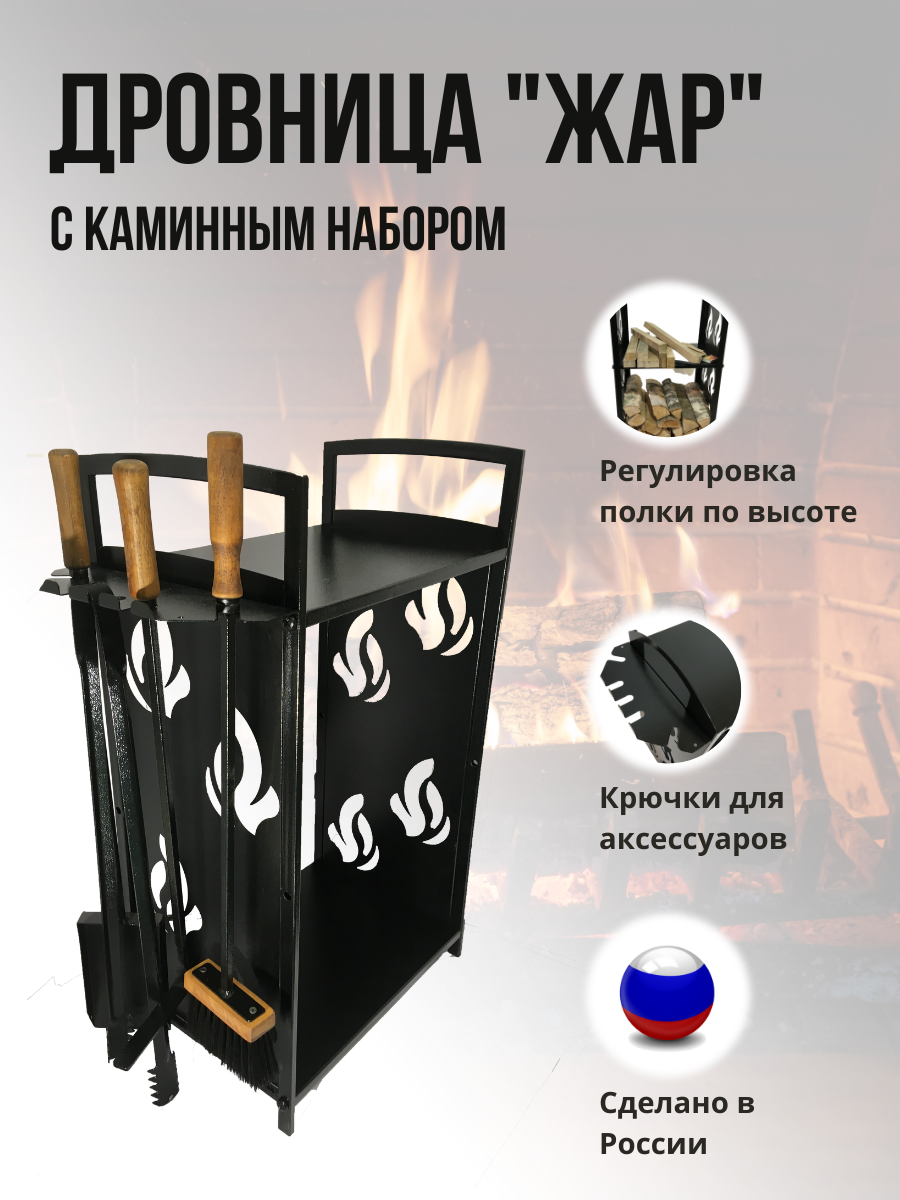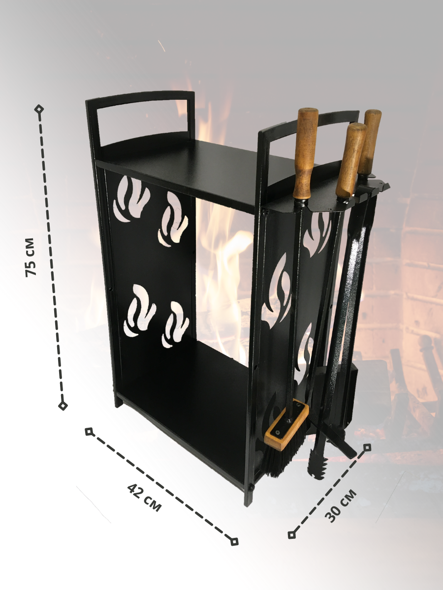 Металлическая дровница Жар является незаменимым атрибутом для компактного хранения дров у камина в загородном доме или у печи на даче. Подставка для дров позволяет держать под рукой небольшое количество поленьев, которое позволит сразу же развести огонь; избавит от мусора; облегчит уборку, а также предотвратит повреждение пола острыми сучками и щепками; имеет эстетичный вид, что придаёт особый стиль интерьеру. Дровница для камина оснащена крючками, где можно разместить входящий в комплект набор по уходу за камином: щипцы для поленьев, щетка для золы, совок, кочерга для углей. Аксессуар для хранения дров Жар с каминным набором легко собирается в течение 10 минут. Верхняя полочка регулируется по высоте. Изделие выполнено из 1,5 мм листового металла – сталь3 с порошковым покрытием, что обеспечивает надежность, прочность и долговечность конструкции.