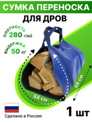Прочный материал и удобный размер: полипропилен плотностью 280 г. Размер: 88 см в длину, 48 см в ширину, с ручками длиной 35см и с застежкой фастекс для того, что бы поленья надежно держались в сумке при переноске. Удобные ручки: прочные ручки из хлопковой ткани толщиной 3 см.