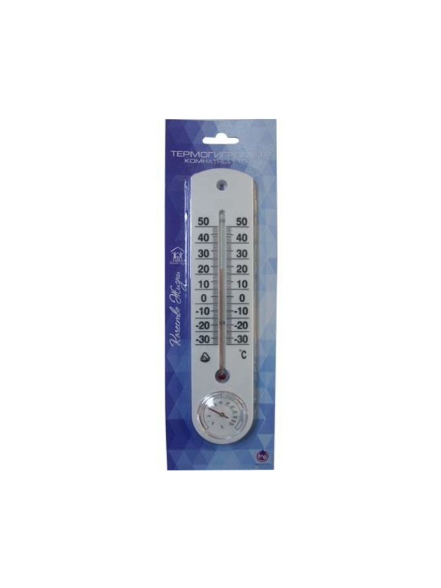 В верхней части корпуса расположена шкала для измерения температуры, а в нижней части установлен стрелочный гигрометр.