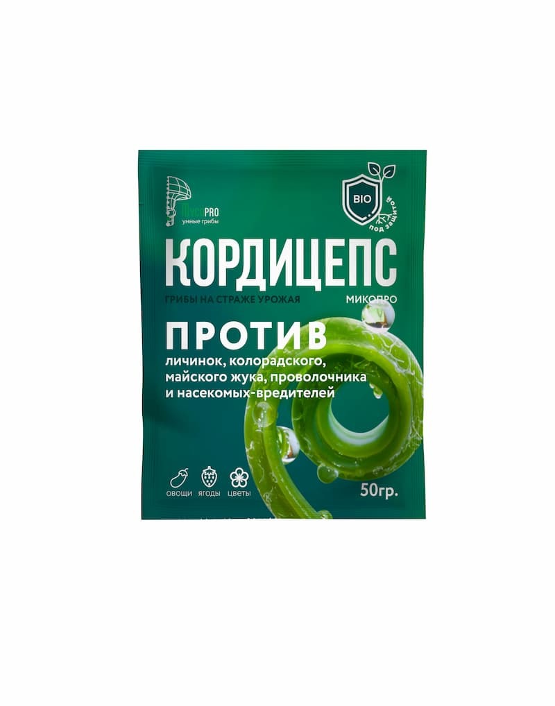 БИОинсектицид "Кордицепс-Микопро" – это эффективное средство против личинок майского и колорадского жука, совок, проволочника, медведки. Основан на Paecilomyces fumosoroseum с титром 1,8*10¹⁰ КОЕ/г, поражающем вредителей на всех стадиях развития.