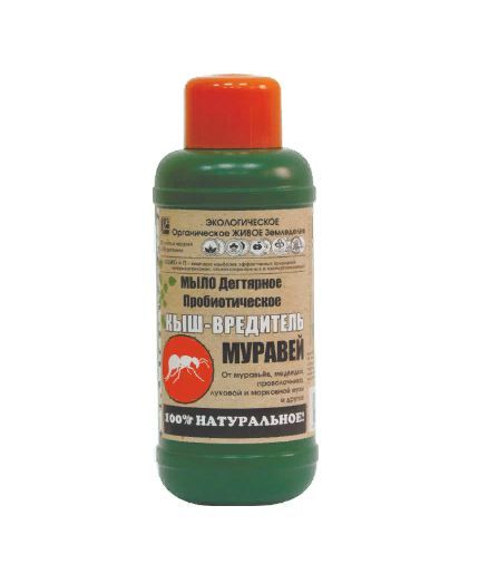 Для профилактики болезней растений и эффективной борьбы с вредителями садовых участков. КЫШ-ВРЕДИТЕЛЬ МУРАВЕЙ отпугивает и уничтожает муравьев, медведку, проволочника, луковых и морковных мух, скрытохоботника. Мыло представляет собой густую коричневую жидкую смесь, основными ингредиентом которой являются калийные соли жирных кислот, березовый деготь и полезные природные бактерии – пробиотики. Для производства мыла используются только натуральные ингредиенты.
