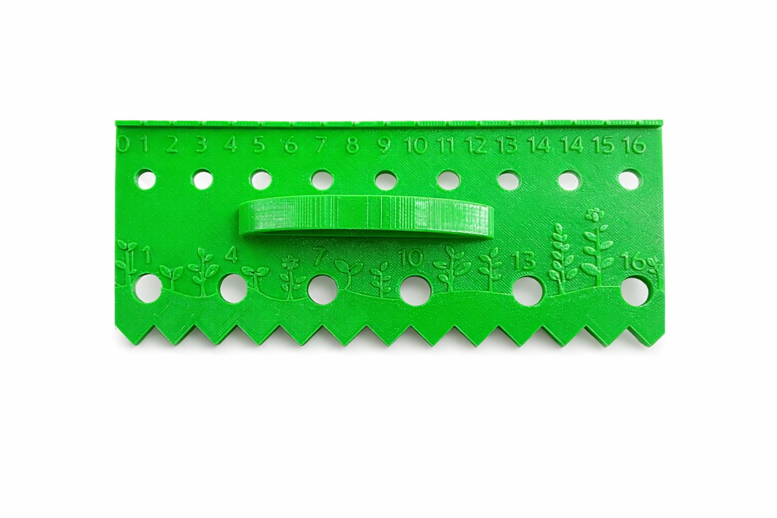 Линейка оснащена чёткой шкалой с отметками в сантиметрах и отверстиями для точечного посева диаметром около 1 см. Отверстия обеспечивают точное расстояние между семенами — 2, 3, 4, 5, 8 или 10 см, что позволяет сразу соблюдать агротехнические нормы без дополнительной разметки. Конструкция продумана таким образом, чтобы инструмент было удобно держать в руке: удобная рукоятка обеспечивает хороший захват и контроль при работе, а длина линейки позволяет достигать труднодоступные места в горшках, контейнерах или на открытом грунте.