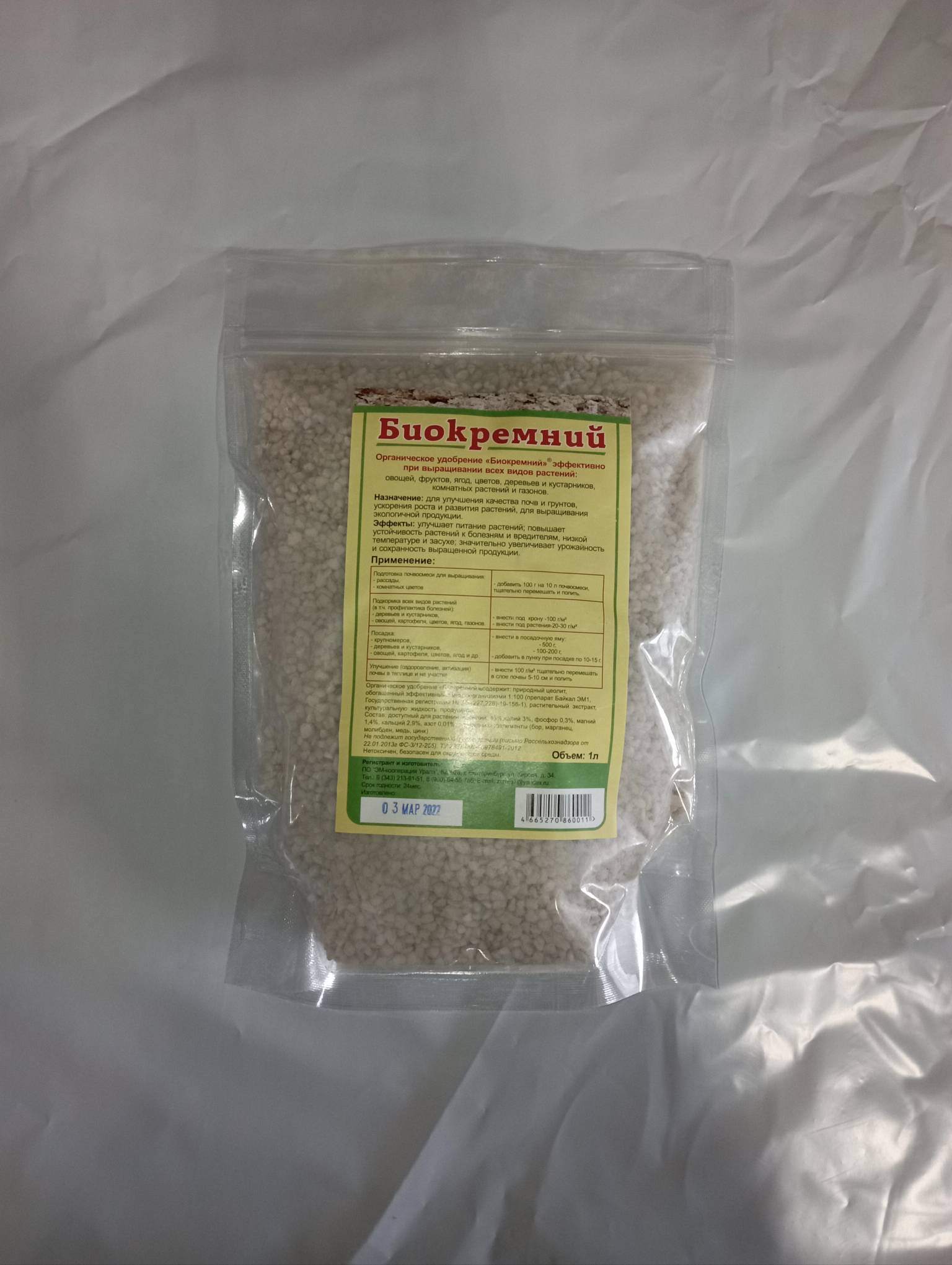 Органическое удобрение «Биокремний» содержит природный цеолит, в котором до 46% доступного для растений кремния, а также 3% калия, 0,3% фосфора, 1,4 магния, 2,9% кальция, микроэлементы (бор, марганец, молибден, медь, цинк).