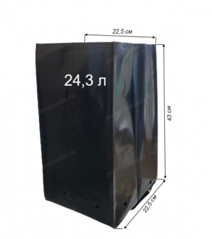 Пакеты для рассады и саженцев 24,3л отлично подходят для временного содержания посадочного материала до высадки в грунт. Изготовлены из плотного полиэтилена черного цвета, не пропускающего солнечные лучи. Дренажные отверстия обеспечивают рассаде благоприятные условия для развития. Технология применения проста, её освоит любой начинающий огородник и садовод. В пакет для выращивания рассады необходимо насыпать грунт или торф, увлажнить при помощи пульверизатора или лейки, добавить немного удобрений, затем положить семена и присыпать их землей. Семена быстрой взойдут при данном способе посадки, примерно через 3-5 дней. Полиэтиленовые мешки для рассады можно использовать несколько сезонов. Преимущества пакетов для рассады: -удобство и легкость применения; -экономия пространства; -безопасность для растений; -доступная стоимость; -легкий вес; -прочность. Плотность: 150 мкм Размеры пакета 22,5*22,5*55 см, после заполнения грунтом D=28 см, H=42 см