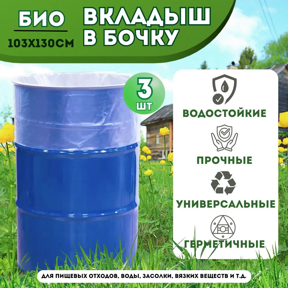 Мешок для бочки с круглым дном 200 л из специально разработанного состава, на основе высококачественного ПВД (полиэтилен высокого давления низкой плотности/ LDPE) высшего сорта. Мешки - вкладыши подойдут для металлических и пластмассовых бочек 200 л с круглым дном. Надежные и прочные, абсолютно герметичные для жидкостей большой плотности, просты и доступны в применении. Вкладыши в бочку подходят для хранения воды и пищевых продуктов. Эластичны, идеально скользят по металлической поверхности, процесс помещения внутрь быстр и не утомителен. Высокопрочны к ударам, изломам, трению о металл и фиксирующий обруч. Эффективная защищают бочку от коррозии, плесени и т.д. Вкладыши рассчитаны на 200 литров, что очень удобно. Верхнюю часть вкладышей можно просто завернуть и соответствующим образом закрепить, чтобы он хорошо держался на горловине бочки. Преимущества - нет необходимости чистить и мыть бочку после заквашивания в ней травы и т.п. - защищает металлическую бочку от коррозии - помогает сохранить воду чистой и свежей на более длительный срок Цвет: ПРОЗРАЧНЫЙ Для стальных бочек 200 л. 580*130: материал: многослойный ПВД (полиэтилен высокого давления низкой плотности/ LDPE); - диаметр дна: 580 мм.; плоская ширина пакета: 900 (+/- 5 мм.); длина пакета: 1100 (+/- 5 мм.) толщина полиэтилена: 130 мкм