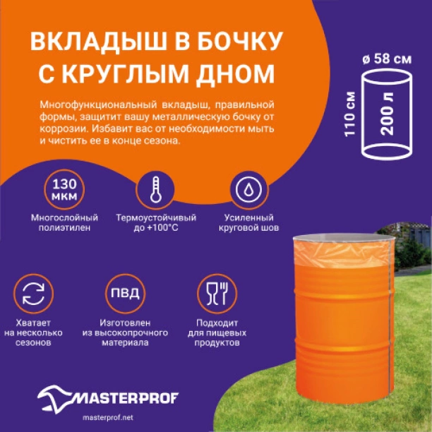 Мешок для бочки с круглым дном 200 л из специально разработанного состава, на основе высококачественного ПВД (полиэтилен высокого давления низкой плотности/ LDPE) высшего сорта. Мешки - вкладыши подойдут для металлических и пластмассовых бочек 200 л с круглым дном. Надежные и прочные, абсолютно герметичные для жидкостей большой плотности, просты и доступны в применении. Вкладыши в бочку подходят для хранения воды и пищевых продуктов. Эластичны, идеально скользят по металлической поверхности, процесс помещения внутрь быстр и не утомителен. Высокопрочны к ударам, изломам, трению о металл и фиксирующий обруч. Эффективная защищают бочку от коррозии, плесени и т.д. Вкладыши рассчитаны на 200 литров, что очень удобно. Верхнюю часть вкладышей можно просто завернуть и соответствующим образом закрепить, чтобы он хорошо держался на горловине бочки. Преимущества - нет необходимости чистить и мыть бочку после заквашивания в ней травы и т.п. - защищает металлическую бочку от коррозии - помогает сохранить воду чистой и свежей на более длительный срок Цвет: ПРОЗРАЧНЫЙ Для стальных бочек 200 л. 580*130: материал: многослойный ПВД (полиэтилен высокого давления низкой плотности/ LDPE); - диаметр дна: 580 мм.; плоская ширина пакета: 900 (+/- 5 мм.); длина пакета: 1100 (+/- 5 мм.) толщина полиэтилена: 130 мкм