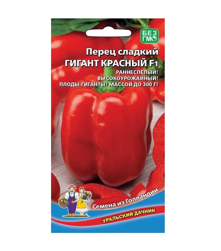 Раннеспелый гибрид для выращивания в открытом грунте и в теплицах. Растение, высотой до 1 метра, буквально усыпано плодами-гигантами массой до 300 г. Гигант красный F1— один из самых толстостенных среди сладких перцев. Толщина стенки — до 1,2 см. Универсальное использование.