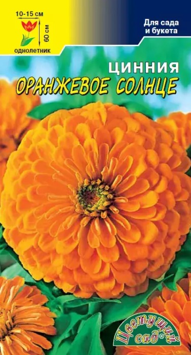 ЦИННИЯ ГЕОРГИНОВИДНАЯ ОРАНЖЕВОЕ СОЛНЦЕ Великолепный сорт циннии, с крупными махровыми соцветиями необычной окраски, диаметром до 15 см. Растения высотой до 90 см, отлично смотрятся на клумбе и великолепны для срезки. АГРОТЕХНИКА Цинния - однолетнее растение. Выращивается как рассадой, так и прямым посевом семян в грунт. Глубина заделки семян не более 0,5 см. Когда минует угроза заморозков, производят высадку рассады в грунт или прямой посев семян. Дальнейший уход заключается в поливах и подкормках. Цинния предпочитает хорошо дренированные, плодородные почвы. При выращивании рассадой для получения хорошего результата по всхожести и росту рассады, применяйте торфяные таблетки. *Дизайн упаковки может быть изменён.