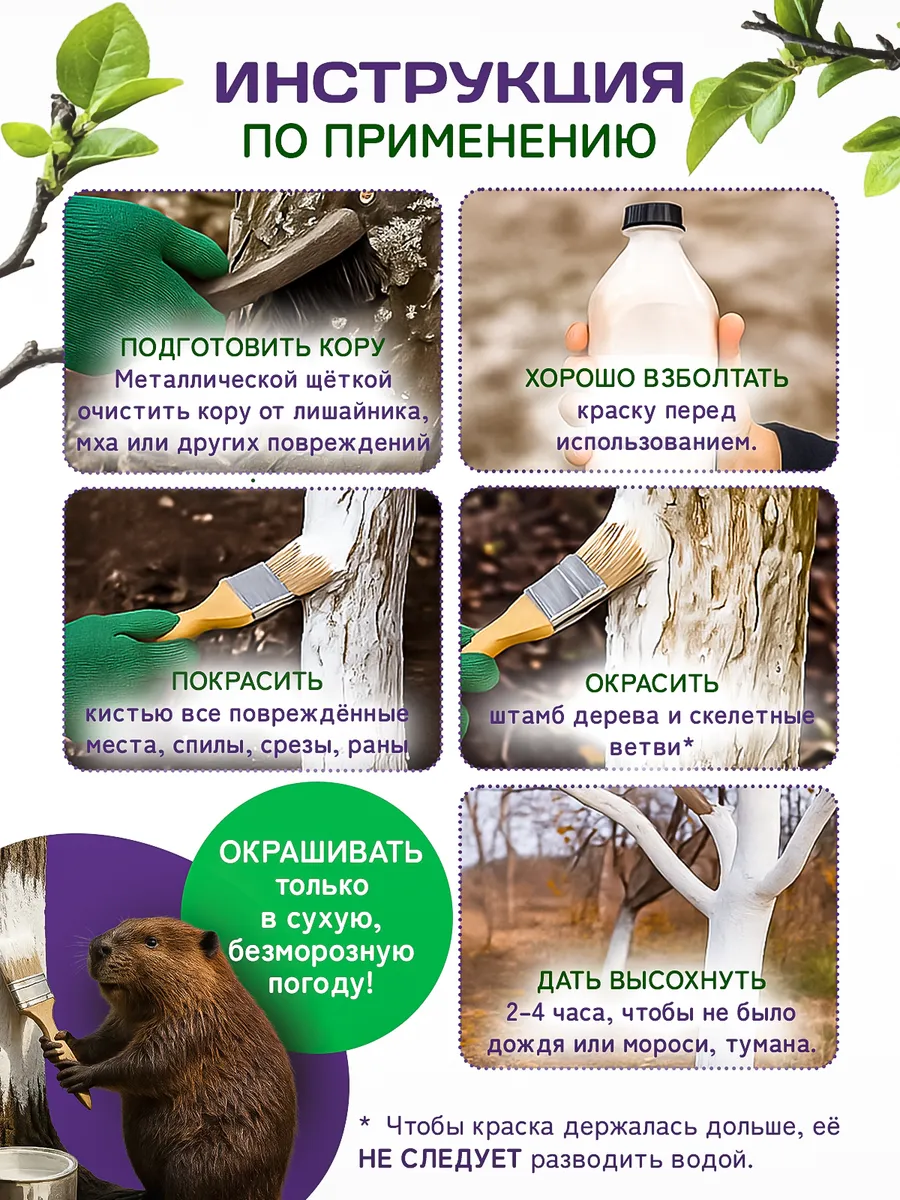 защищает деревья от ультрафиолетовых лучей, болезней, насекомых-вредителей и солнечных ожогов. |