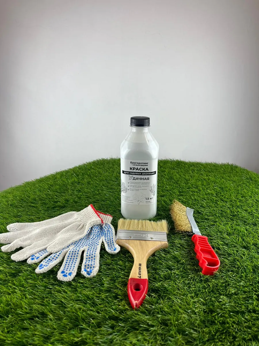 Набор предназначен для обработки и защиты деревьев в саду: очистки коры, нанесения садовой краски и защиты стволов от вредителей и неблагоприятных условий.