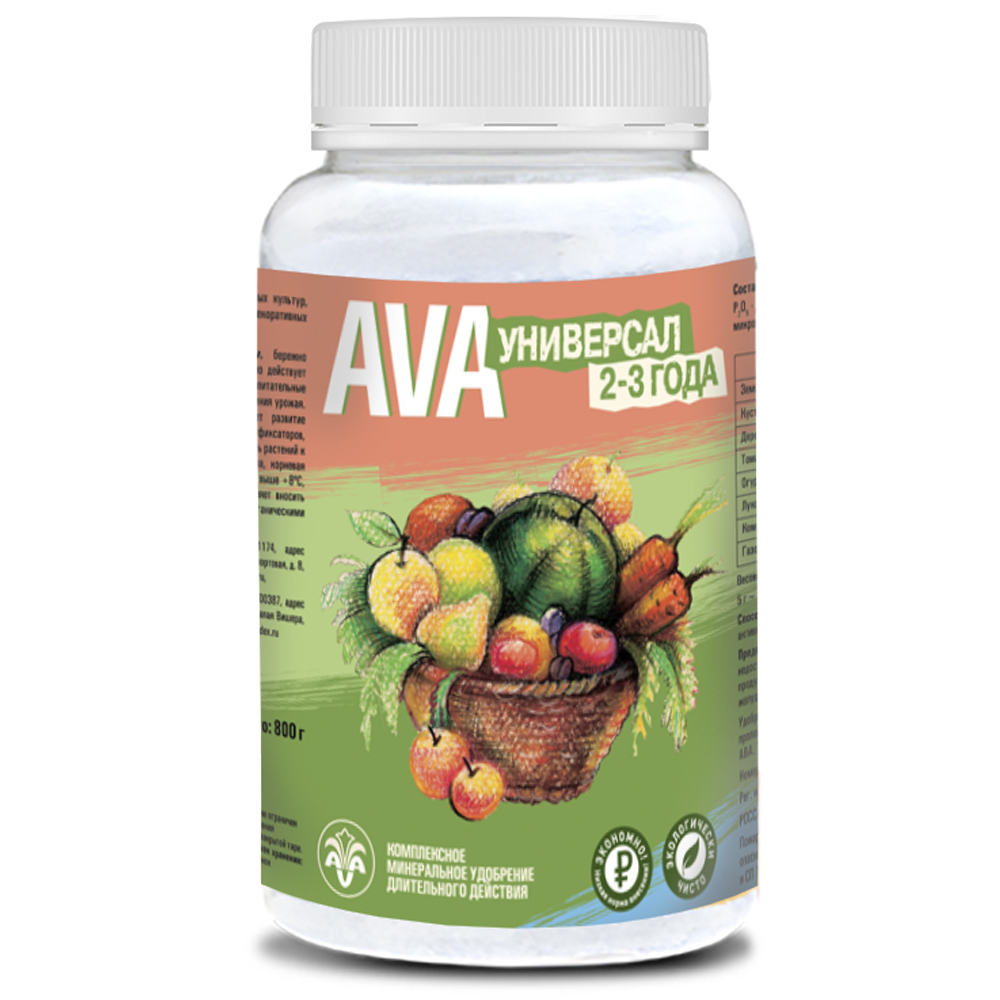 Вносится под землянику, малину, ягодные кусты (смородину, крыжовник, жимолость и т.д.), под плодовые и косточковые культуры (яблоню, абрикос, вишню, сливу, облепиху, рябину), под все многолетние цветы и декоративные кустарники, хвойники, при посадке чеснока и луковичных цветов. Для косточковых и южных растений (виноград, самшит), привыкших к бедным азотом почвам, AVA особенно эффективно.