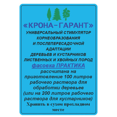 "КРОНА-ГАРАНТ" - новый высокоэффективный биологически активный препарат, предназначенный для восстановления частично утраченной и поврежденной при пересадке корневой системы деревьев и кустарников как лиственных, так и хвойных пород. Позволяет увеличить объем всасывающей зоны корневой системы в 3-4 раза в течение 10-12 дней после обработки препаратом. Содержит компоненты необходимые для оптимального развития как хвойных, так и лиственных деревьев. Сочетает свойства препаратов СПАС и ХВОИНКА. Рекомендуется к применению альтернативно этим препаратам: ранней весной (апрель), когда отдельное применение препаратов СПАС и ХВОИНКА не столь эффективно из-за низких температур, и во второй половине лета, так как ГАРАНТ не столь активен в жаркий период и не вызывает излишнего прироста, нежелательного в конце сезона (август-сентябрь). Биоактивные свойства прпарата позволяют считать его ключевым (основным) в группе стимуляторов КРОНА . Не имеет аналогов.